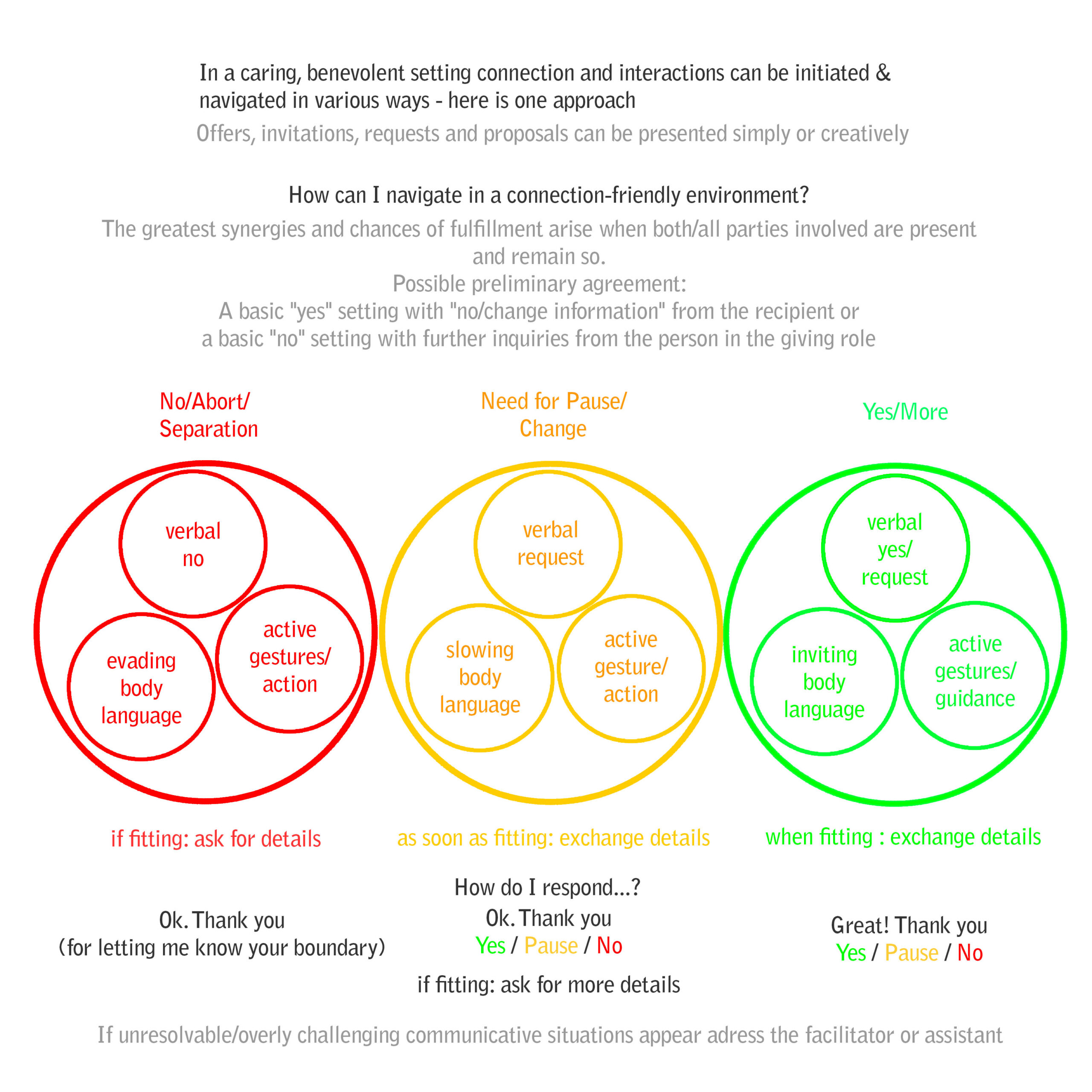 Throught different personal experiences, personal preferences, and social or chosen subconscious programming each person has their own communication pattern. To make social interactions beneficial & synergetic, the ability to communicate your No, Pause/Distances, Yes on the one hand and the ability to receive these revelations with grace on the other side are key ingredients.