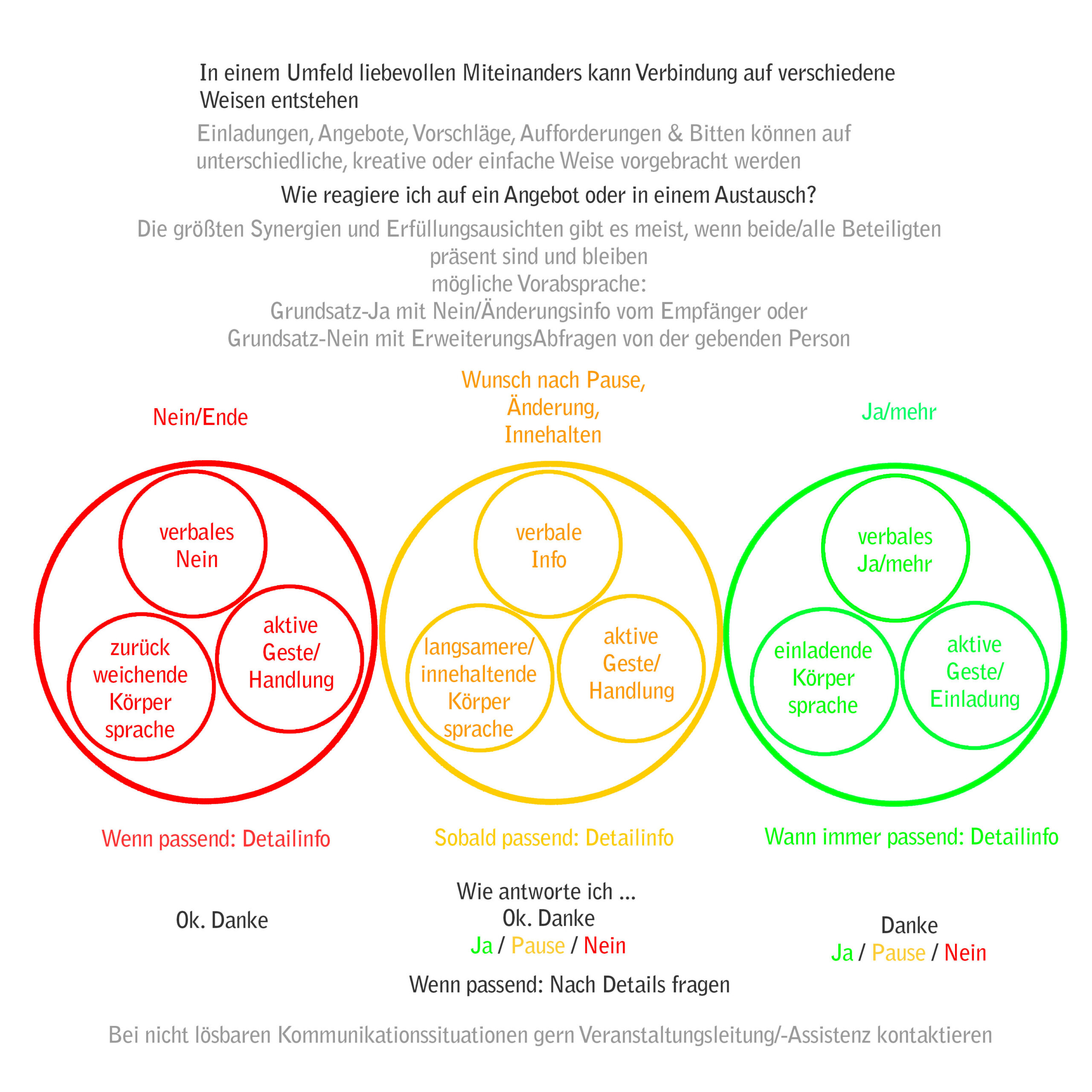 Dein Nein ist willkommen und notwendig, wenn es ausgesprochen wird. Es bildet die Grundlage für die anderen beiden möglichen Antworten. Deine Distanz-&-Nähe-Navigation wird respektiert und wertgeschätzt. Dein Ja ist willkommen und erwünscht. Lass es deutlich werden.